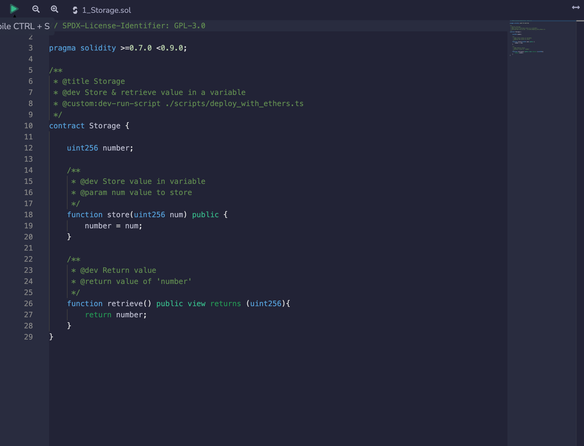 En la parte superior, verás una gran flecha verde similar al botón Ejecutar en otros editores. En Solidity, esto compila tu código, pero no lo ejecuta porque primero debes desplegar tu código en la cadena de bloques simulada.